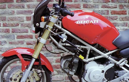 Features19 Adjustments. Includes full mounting kit & hardware. Damper available in Black, Blue, or Red.Aeronautic grade aluminium AL7075 rearned to a tolerance of 5 micron. Polished to a high gloss to reduce friction. The body is then anodised.Rods are made from CK45 steel and finished to a close tolerance. The ball joints are manufactured in Japan, self lubing without the need for grease nipples.Toby steering dampers are manufactured with an expansion reservoir, to house the oil which expands when the friction generates heat in use.The expanding oil moves into the reservoir with the heat and returns into the damper body as it cools automatically.The fork clamp, damper mountings and body straps are all machined from aeronautic billet aluminium and all pieces are machined before anodising. All parts of steering damper kit are manufactured in Toby workshops on CNC MORI SEIKI machining center to a high tolerance. Ducati Monster 600 620 695 94-07 Toby Steering Damper & Complete Mounting Kit?